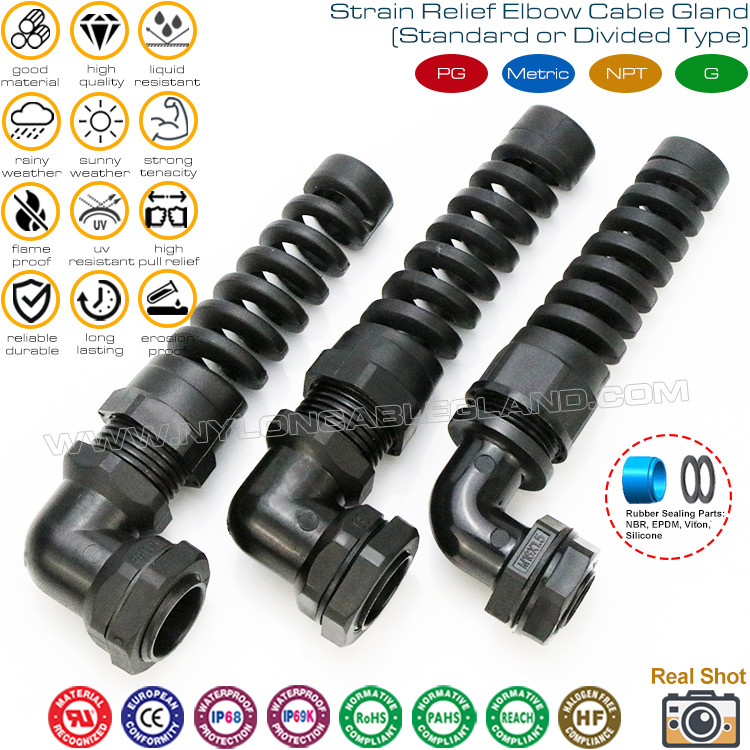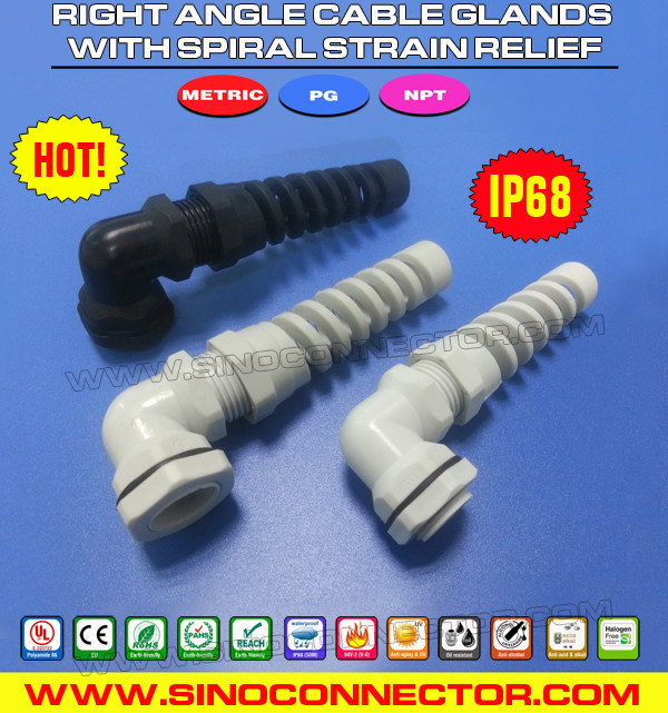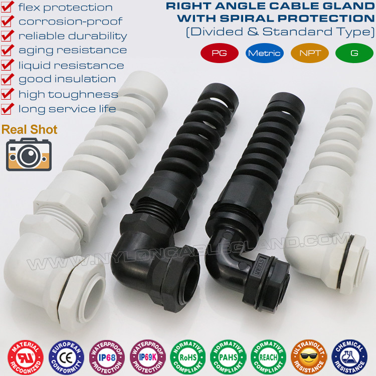 | Productnaam: | PG & metrische plastic elleboogkabelwartels & IP68 haakse nylon kabelwartels met spiraalvormige flexibele beschermer |