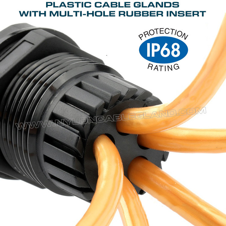 Nylon kabelwartels met meergats afdichtingsinzetstuk voor meerdere kabels door dezelfde opening en ideaal voor klemsysteem. De meergats (multi-entry) kunststof kabelwartels IP68 met PG of metrische schroefdraad voor elektrische behuizingen zijn ontworpen om uw elektrische apparaten te beveiligen die zich in de behuizingen bevinden. Het is voor elke eenheid uitgerust met een trekontlastingsinzetstuk met meerdere gaten, zodat u meerdere draden kunt doorvoeren om verbinding te maken met de poorten van verschillende elektrische apparaten. De waterdichte IP68-kabelwartel zorgt in combinatie met waterdichte pluggen voor betrouwbare bescherming tegen water en stof, waardoor uw elektrische apparaat een zeer volledige bescherming krijgt, vooral als u de apparaten lange tijd niet hoeft te configureren nadat deze in de behuizingen is geïnstalleerd. Eén eenvoudige en snelle montage op de poort helpt bij het verminderen van de mogelijkheid van apparaatvervanging veroorzaakt door problemen zoals waterinsijpeling.