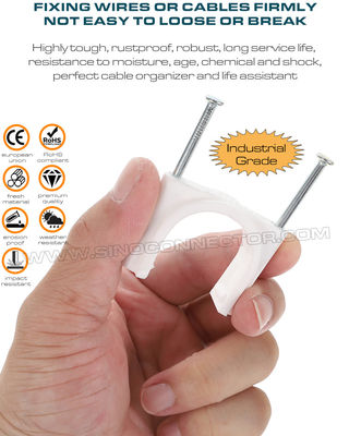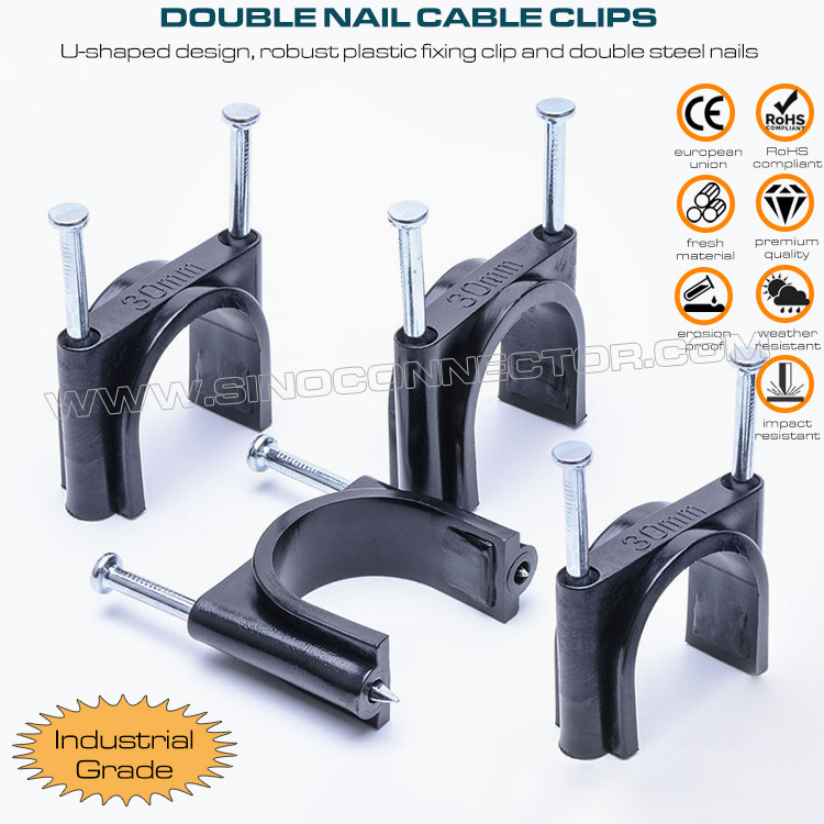 De kabelclips kabelklemmen met dubbele nagel (ronde nagelklemmen met dubbele spijkers, cleme cui cablu) zijn een soort eenvoudig te gebruiken bevestigingsmiddelen die vaak worden gebruikt om grote draden, kabels, snoeren, leidingen, pijpen aan de muur of andere oppervlakken te bevestigen en te bevestigen. Het is gemaakt van polyethyleen (PE) spuitgieten met hoge elasticiteit, slagvastheid en zal nooit breken. Deze serie producten is een spijker-ingevoegd type en de stalen spijkers worden direct aan de kabelklemmen bevestigd, wat veel manuren kan besparen en de bouwkosten kan verlagen.