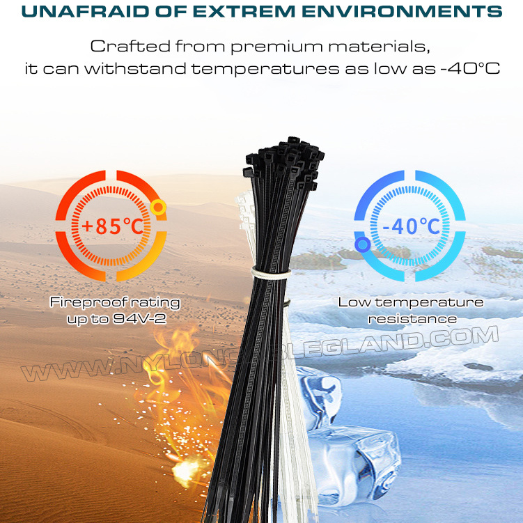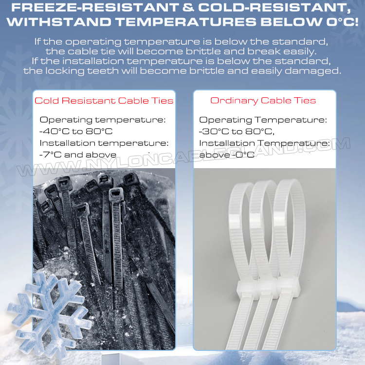 Low-temperature resistant cable ties (also known as cold resistant cable ties) are nylon cable ties designed for cold environments. They are made of low-temperature resistant special nylon materials (such as modified PA6.6 materials). Their advantages include excellent cold shock resistance (resistance to brittle fracture), high strength, high wear resistance, good dimensional stability, and excellent chemical resistance and electrical properties. They can maintain their strength, toughness and brittle resistance at extremely low temperatures (such as -40°C) lower than standard nylon. They are specially used to fix equipment in cold areas or in industrial fields that require low-temperature performance of materials to ensure that items are firmly fixed and safe.